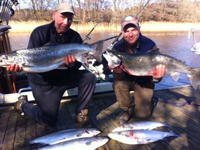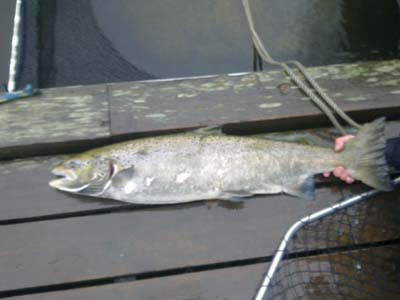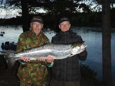 Ensimmäinen tuplatärppi. Ikävä kyllä tällä kertaa sama kala oli kiinni kahdessa eri vaapussa. Tärpin jälkeisessä syöksyssä toinen vaappu rintaevänjuureen kiinni, mutta saatiinpa velipojan kanssa molemmat väsytellä. 12,0kg marjas